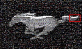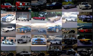 An Automotive Photo Mosaic made up of over 2,000 micro-photos spanning across all generations of Ford Mustangs blending together to form the iconic Mustang pony logo